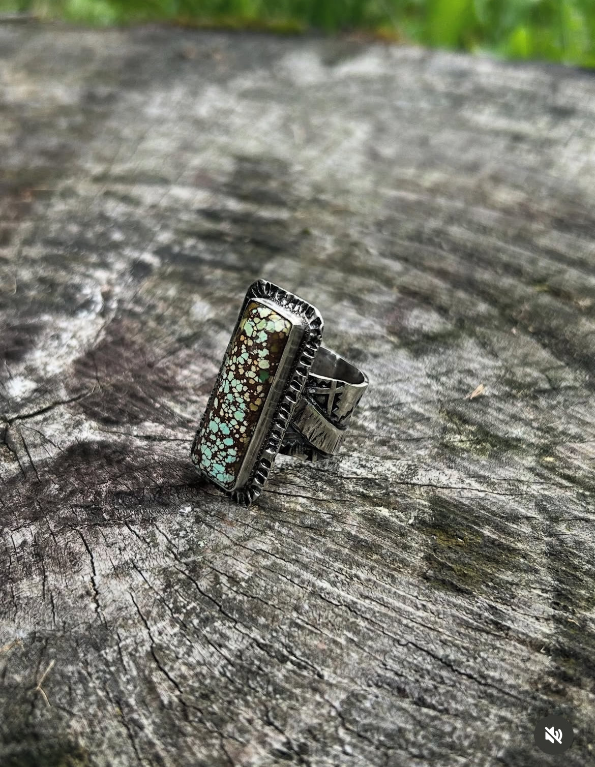 Bague en argent 950 travaillée aux poinçons Amérindiens avec une rare turquoise Red River Bar.