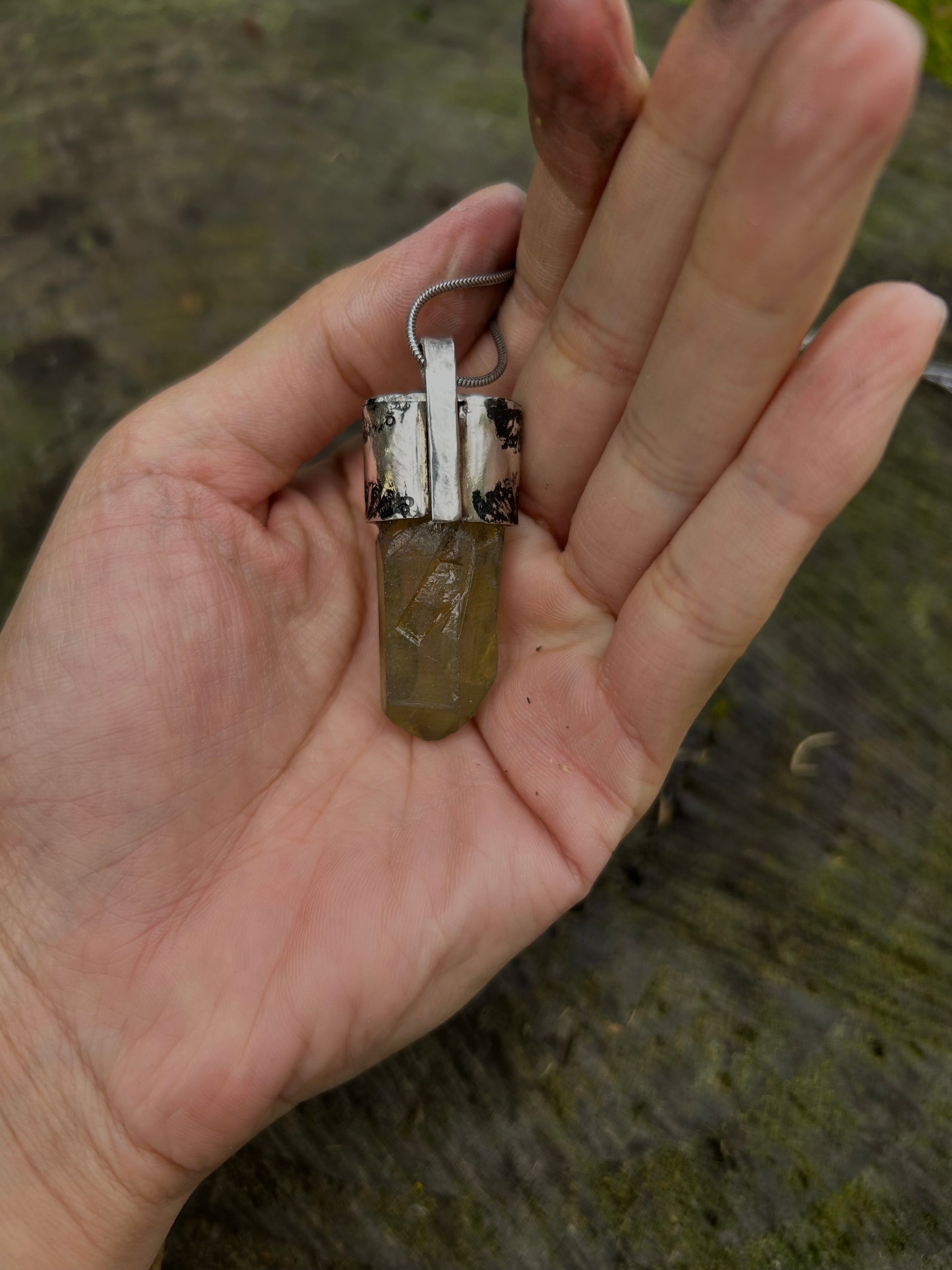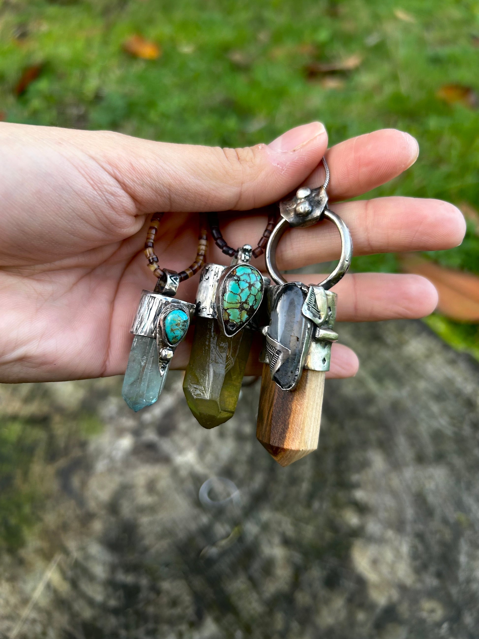 Le corps est en Quartz fumé et turquoise Qingu. Emblème de paix intérieure, le Quartz Fumé se révèle une aide précieuse pour faire face aux difficultés du quotidien. À la fois équilibrante et apaisante, elle favorise l’ancrage dans le présent.
